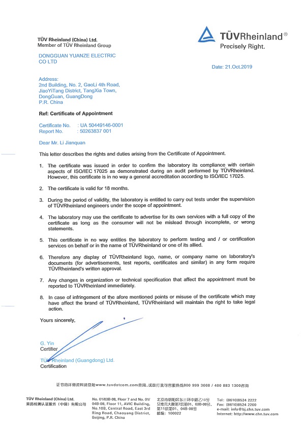 在元則繼電器全體同仁的共同努力之下,元則繼電器于2019年10月28日順利獲得萊茵檢測認證服務(中國)有限公司的TUV認證官方授權。