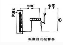 溫度自動報警器:當溫度升高到一定值時,水銀溫度計中水銀面上升到金屬絲處,水銀是導體。因此將電磁鐵電路接通,電磁鐵吸引彈簧片,使電鈴電路閉合,電鈴響報警,當溫度下降后,水銀面離開金屬絲,電磁鐵電路斷開,彈簧片回原狀,電鈴電路斷開,電鈴不再發聲。